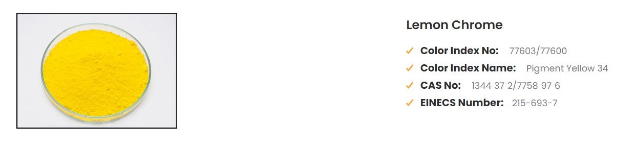 Lemon Chrome - a monoclinic Lead Chromate material. Its of shade and a cleaner Full Tone. This pigment is highly stabilized and offers very good fastness to light and weathering and therefore is extensively used in top-quality Synthetic Enamels.